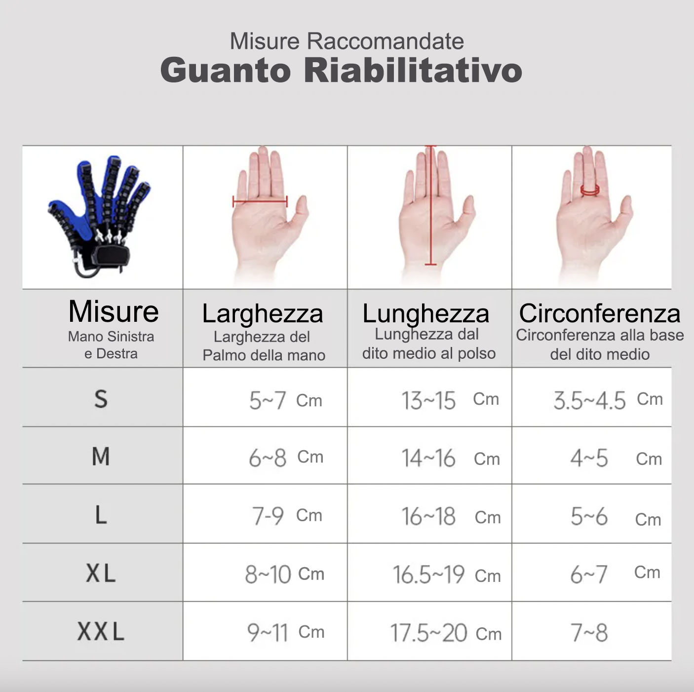 Al momento dell'acquisto puoi selezionare la versione per mano Destra o Sinistra. Per la taglia, abbiamo una guida semplicissima basata sulla lunghezza del palmo. In ogni caso, il materiale è flessibile e le fasce in velcro permettono di adattare il guanto perfettamente alla tua mano. Se dovessi sbagliare, il cambio taglia è gratuito.